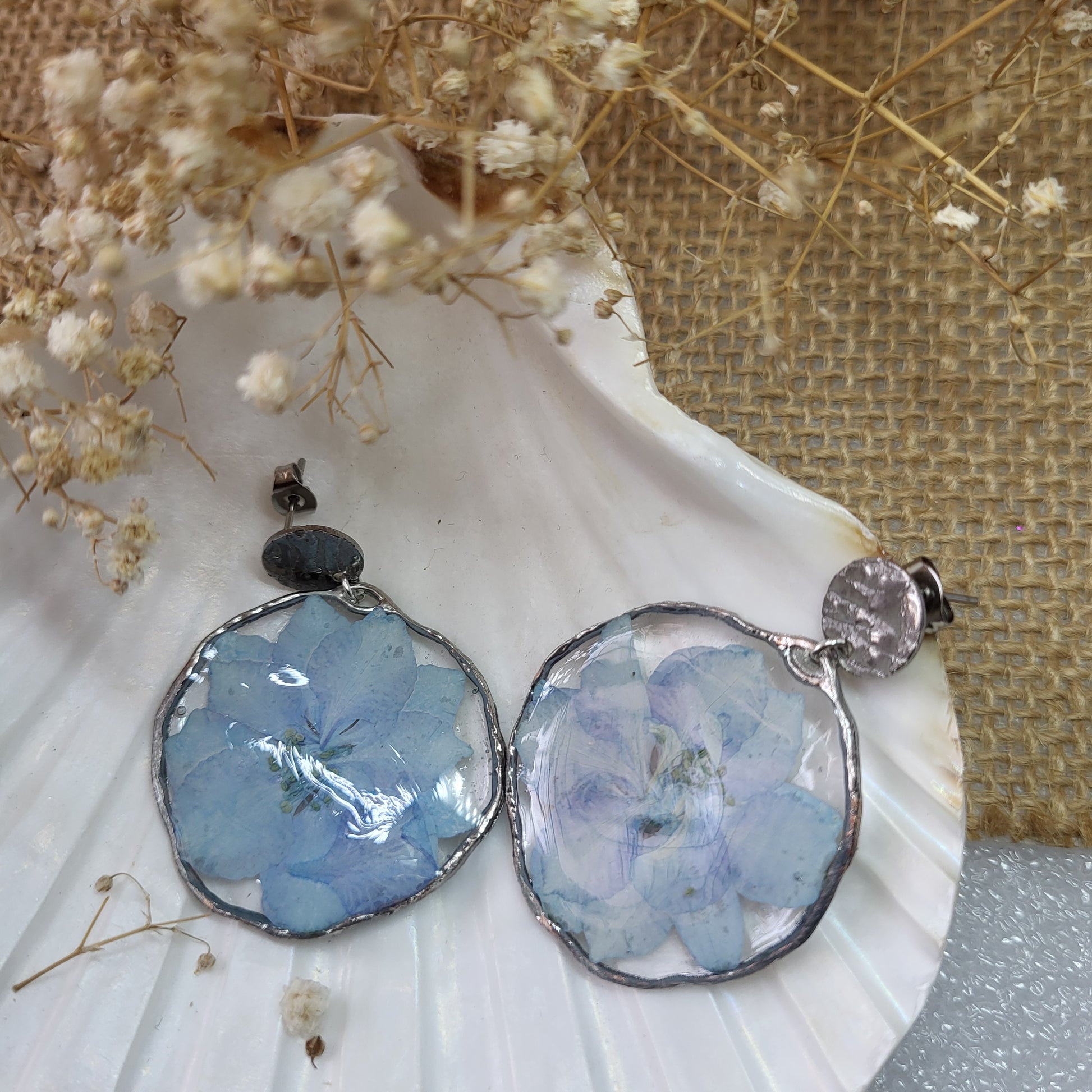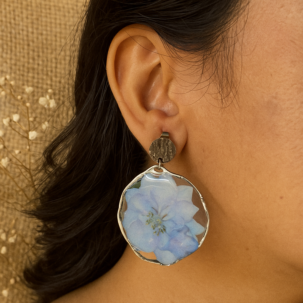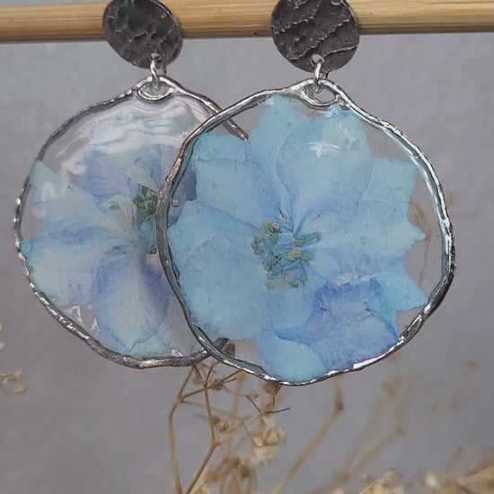 A pair of real blue larkspur flowers, carefully preserved in clear resin and framed with alloy silver-toned bezel. The hammered metal stud top adds an artisanal touch, giving these earrings a balance of natural softness and modern texture.