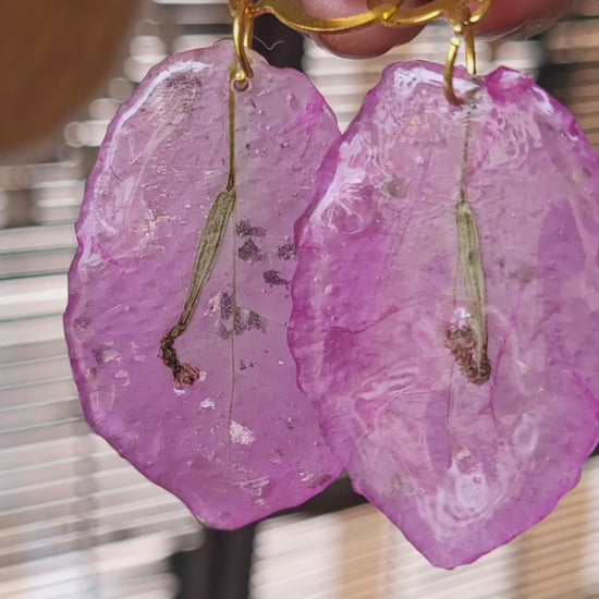 Crafted from real bougainvillea petals preserved in resin, these earrings capture the vibrant spirit of nature in soft pink hues. Each petal retains its natural veins and texture, making every pair unique. Set with golden hooks, they balance raw botanical beauty with a touch of modern elegance.