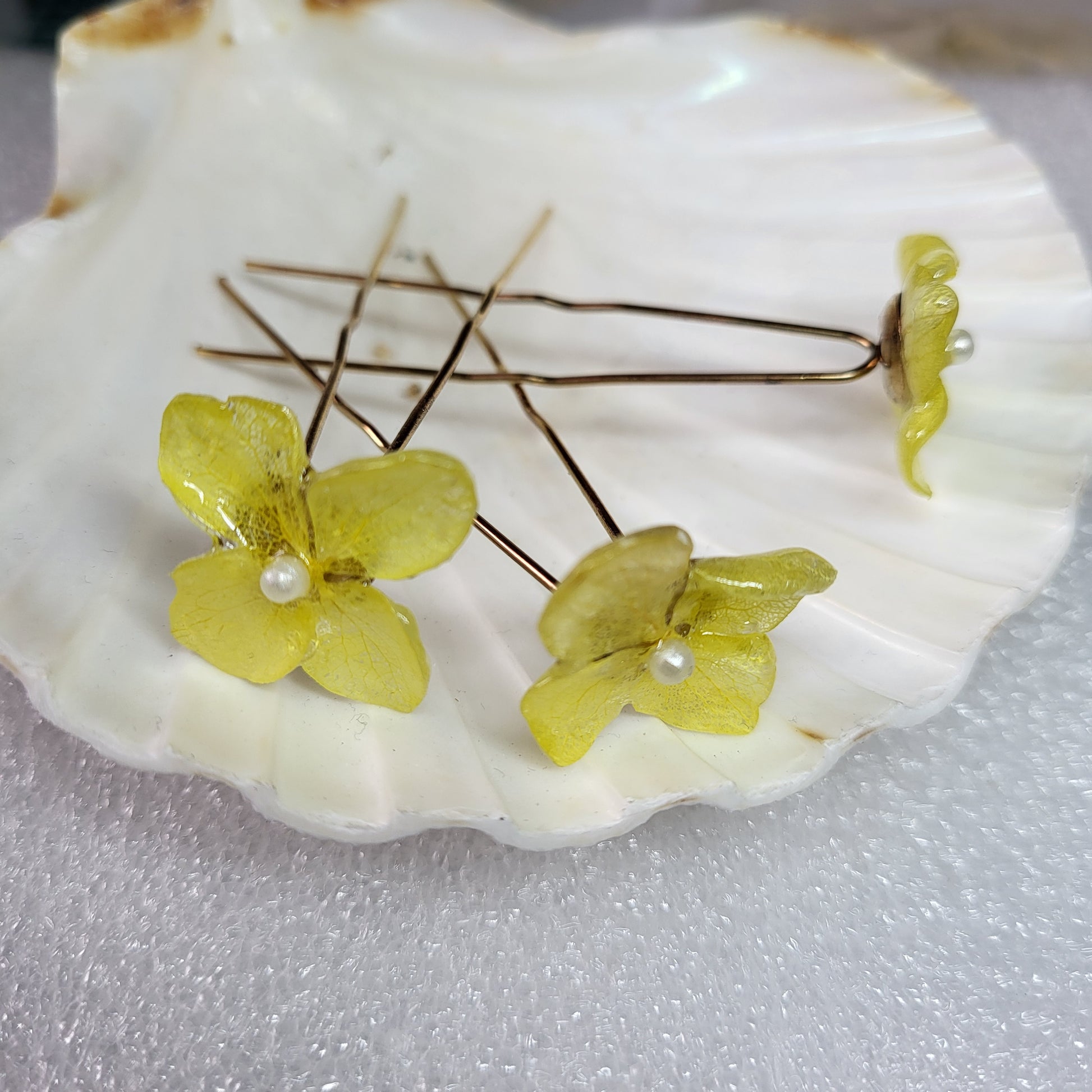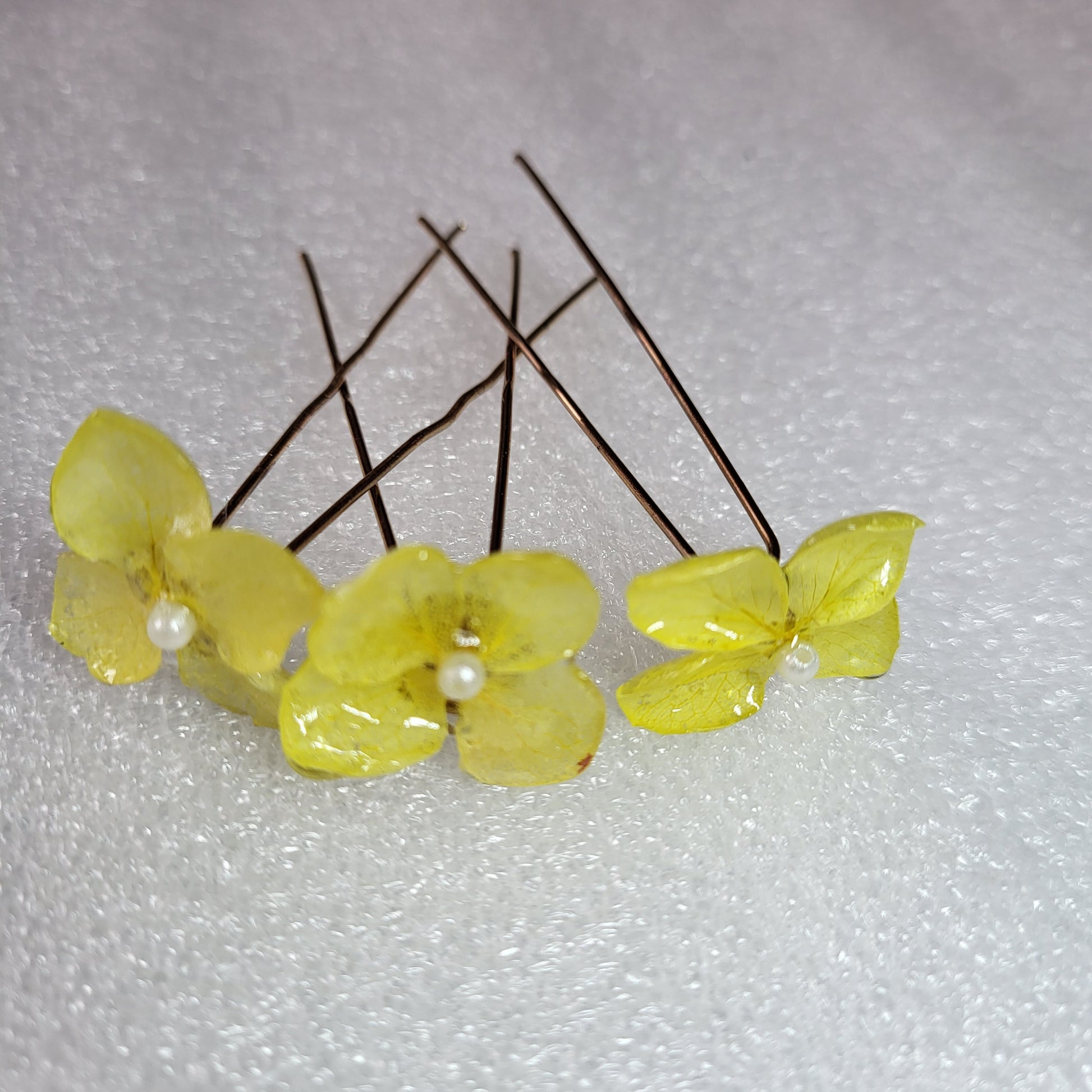These delicate bridal bun pins feature real yellow hydrangea petals preserved in layers of glossy resin, each accented with a dainty pearl at the center. Their soft translucence captures light beautifully, adding a touch of sunshine and elegance to any bridal hairstyle. Lightweight yet striking, they are designed to bring nature’s charm into your special day.