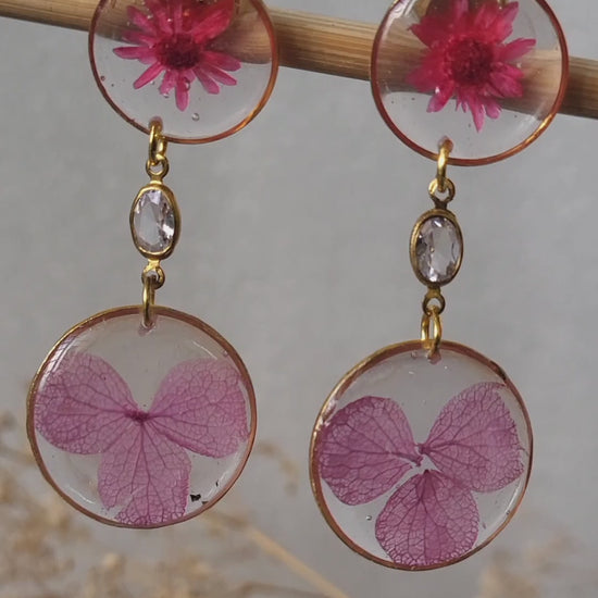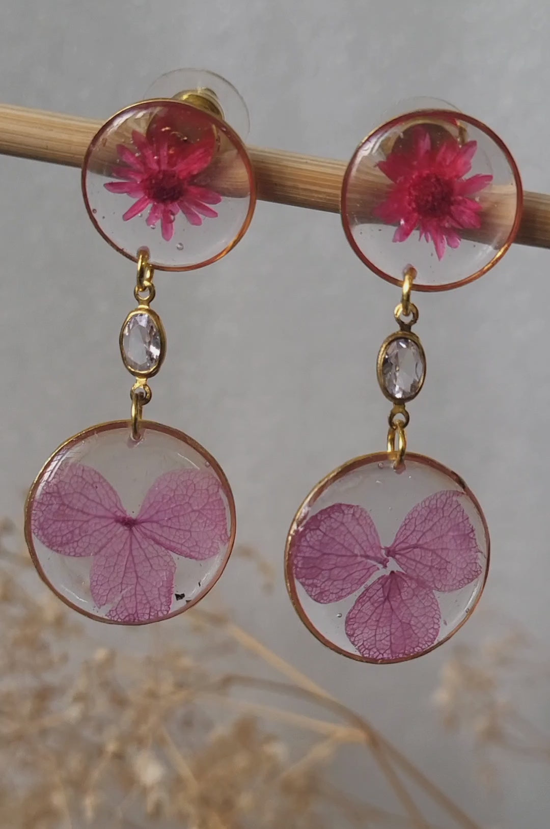 Delicate and eye-catching, these earrings feature real pressed pink daisies and purple hydrangeas encased in clear resin. The gold-toned metal frames and connectors highlight the natural elegance of the flowers, while a subtle crystal detail adds a hint of sparkle. Each pair is a blend of botanical charm and refined craftsmanship.