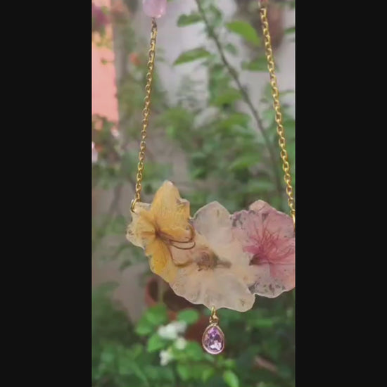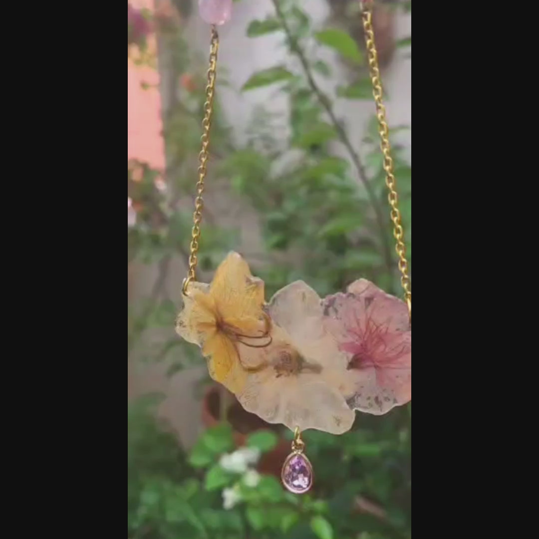 A poetic blend of warmth and grace, Honey Rose Blush captures the gentle glow of sunlight on blooming petals of Larkspur, Petunia, and Cherry Blossom. Delicately preserved and artfully arranged, these blossoms come together in a harmonious floral trio that radiates quiet elegance and natural warmth. The pendant is complemented by a golden chain strung with soft-hued beads that echo the colors of the blooms and a dainty gemstone drop, this piece feels both grounded in nature and effortlessly feminine.