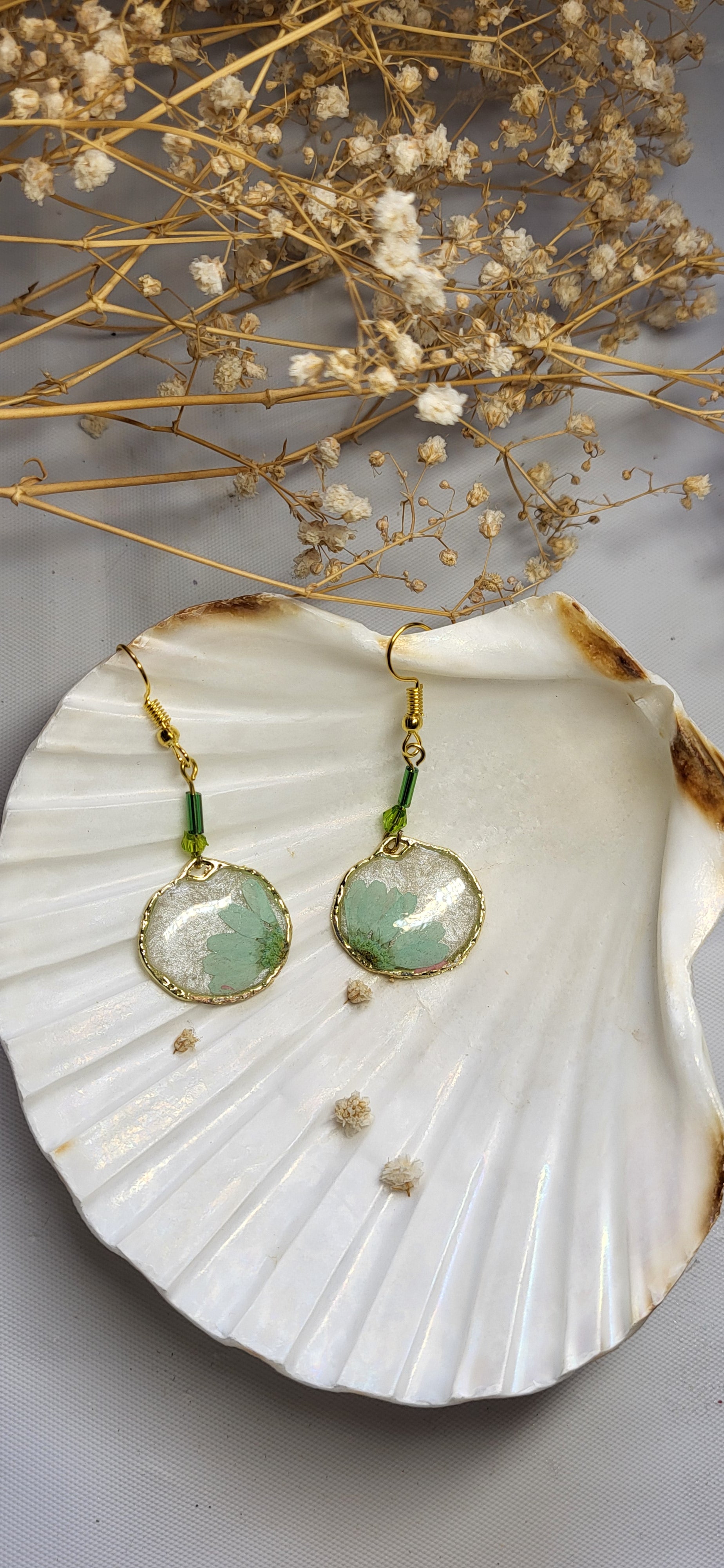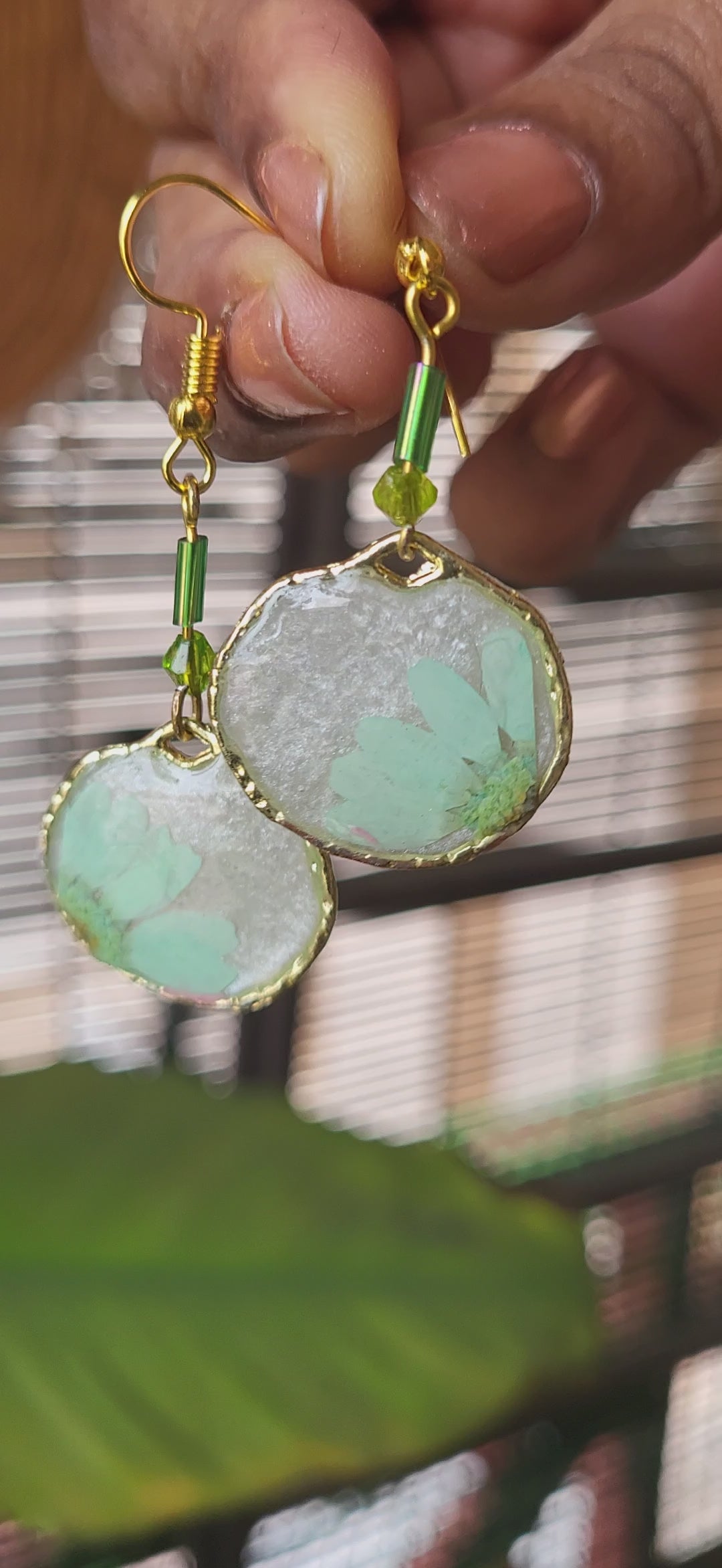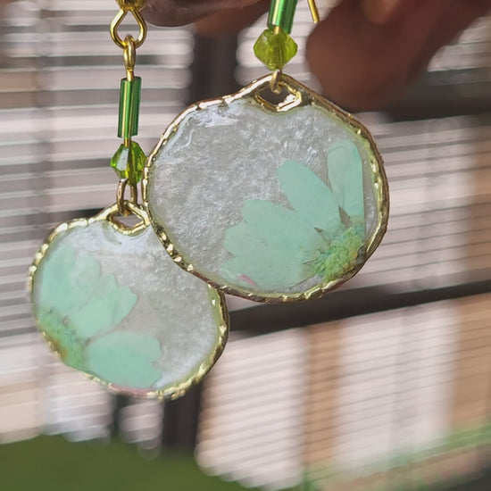 Delicate and fresh, these Mint Meadow Earrings feature real pressed green-tinted flower petals preserved in clear resin, capturing the quiet beauty of nature. Framed with a soft gold-toned bezel and accented with shimmering green crystal beads, these earrings evoke the feeling of a dewy garden at dawn.