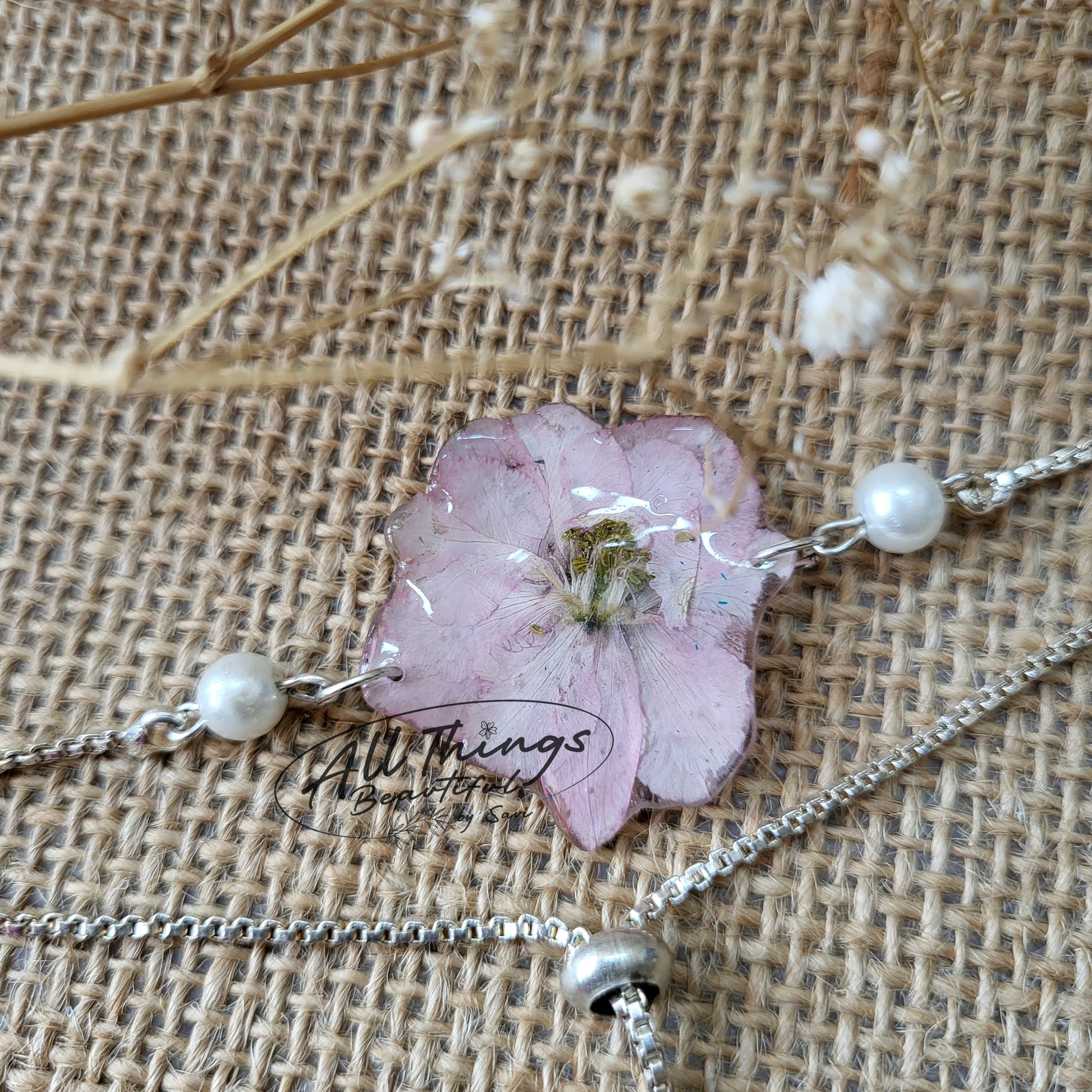 A piece born of soft light and quiet beauty — featuring a real pink larkspur bloom preserved in crystal-clear resin, paired with luminous pearls and a fine silver chain. The bracelet celebrates nature’s fleeting grace, carrying the gentle charm of a flower forever in bloom.