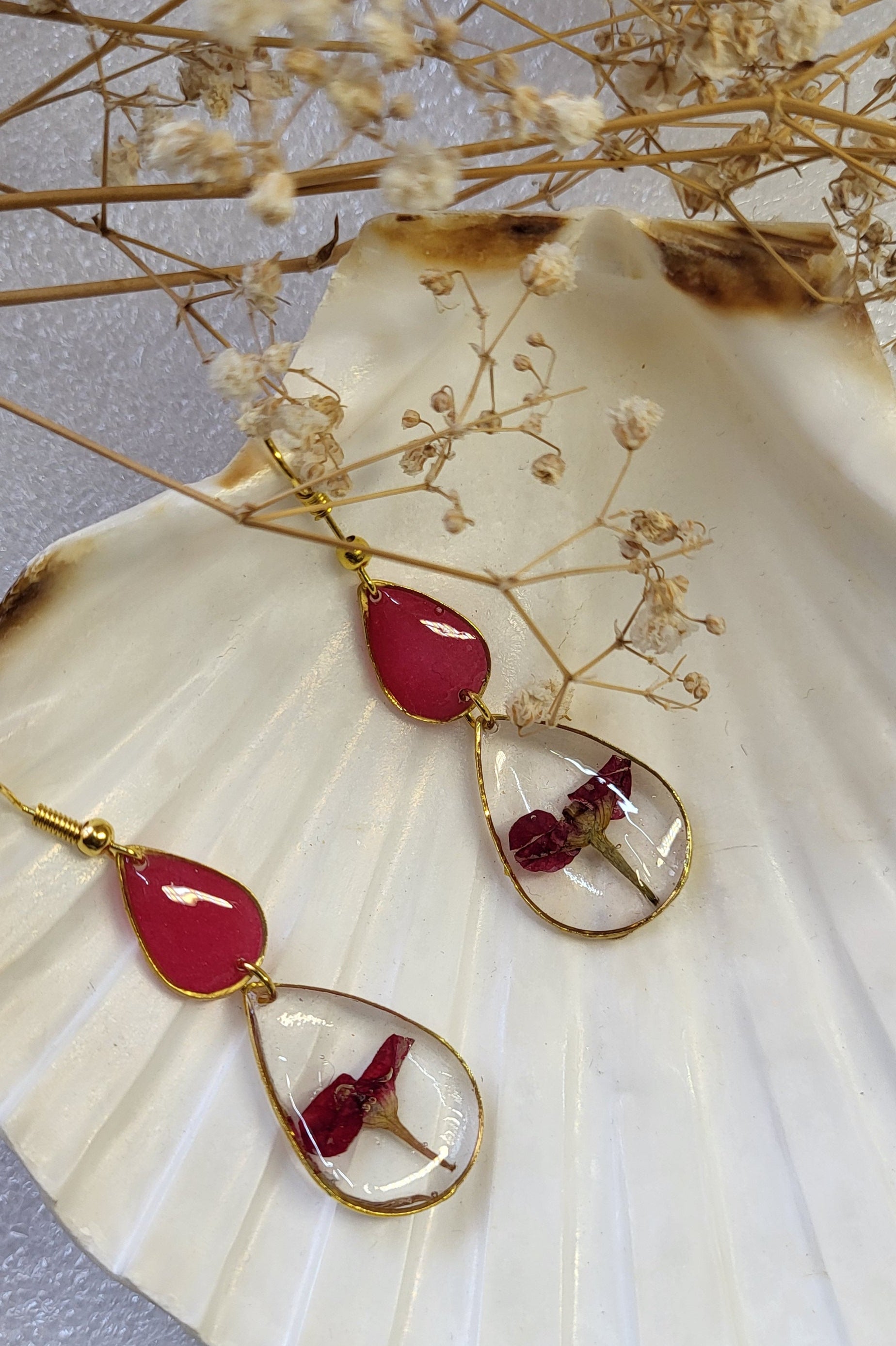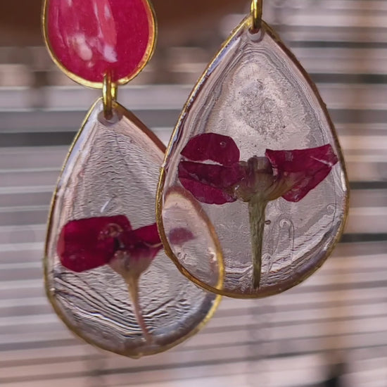 Delicately preserved Red Mili Miniature blooms take center stage in these handcrafted teardrop earrings. The design pairs a bold magenta resin accent on the top drop with a clear resin teardrop below, framing the tiny blossoms in full detail. Accented with a golden outline and hooks, these earrings beautifully merge natural charm with a touch of elegance, making them a standout accessory.