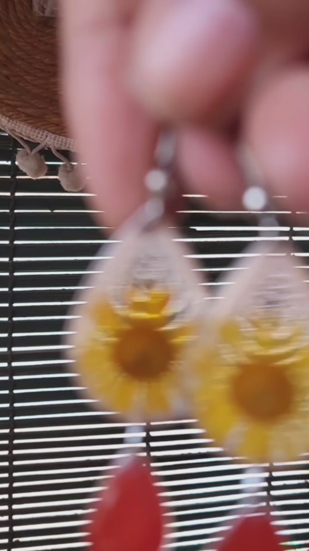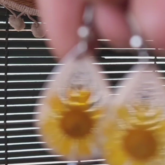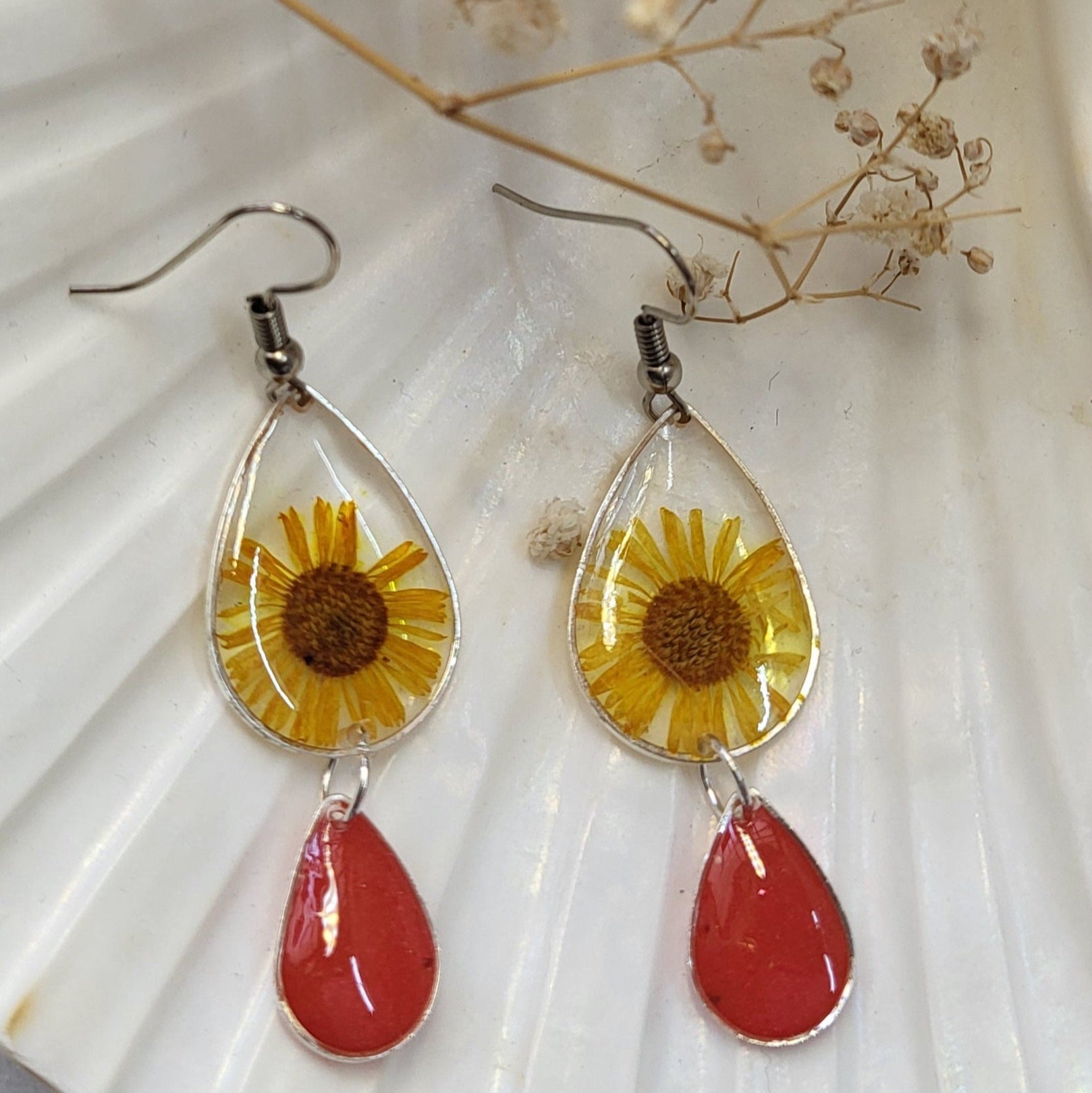 Bright, bold, and full of joy — these earrings bring sunshine wherever they go. Featuring hand-pressed yellow daisies suspended in clear resin, each petal is a tiny burst of golden light. The look is completed with a teardrop of rich coral-red resin, adding a vibrant contrast that dances with every movement.