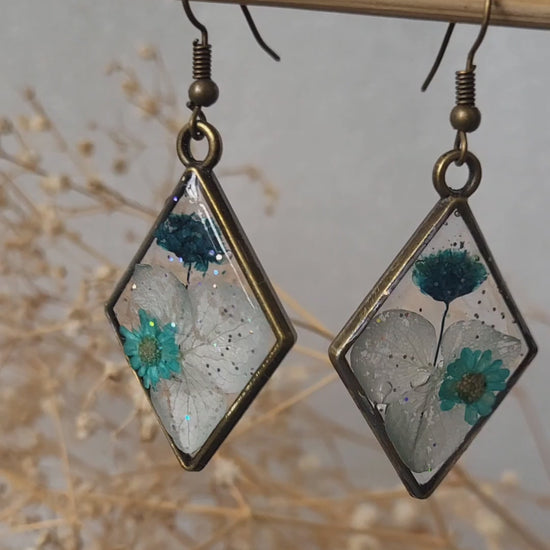 These exquisite dangle earrings feature a delicate gold-plated frame that encloses dried hydrangea florets in clear resin. They have a vibrant, eye-catching shade of teal or turquoise. Their unique shape and preserved texture are a beautiful focal point, adding a soft, botanical touch to the resin pendants.