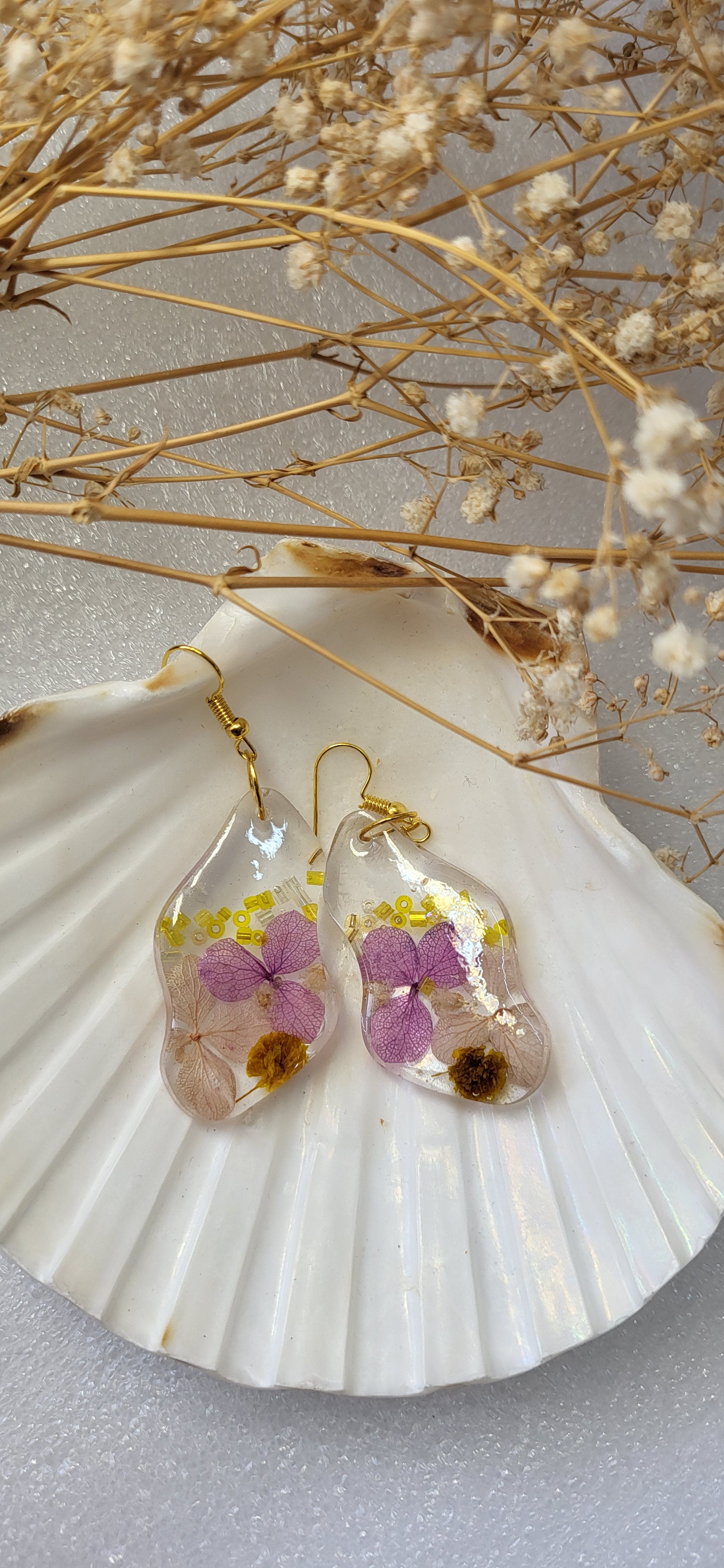 Make a bold yet natural statement with these Wild Bloom Resin Earrings, featuring a freeform organic shape that mimics the gentle flow of nature. Encased in crystal-clear resin, each piece holds real pressed flowers in shades of violet and blush, accented with pops of cheerful yellow florals and playful yellow glass beads for added texture and sparkle.