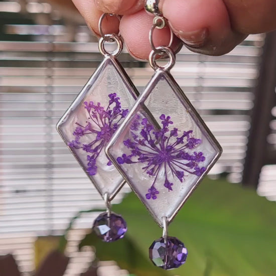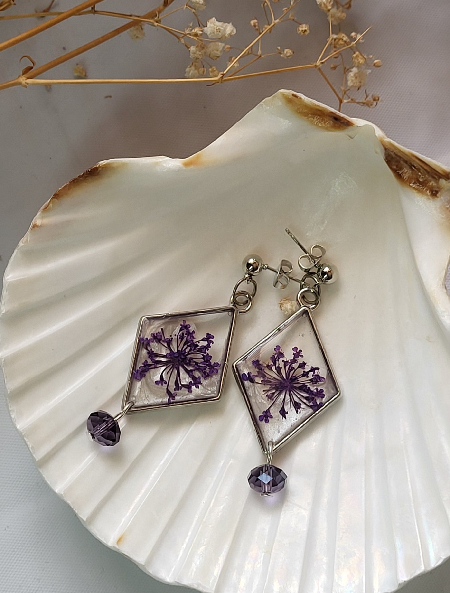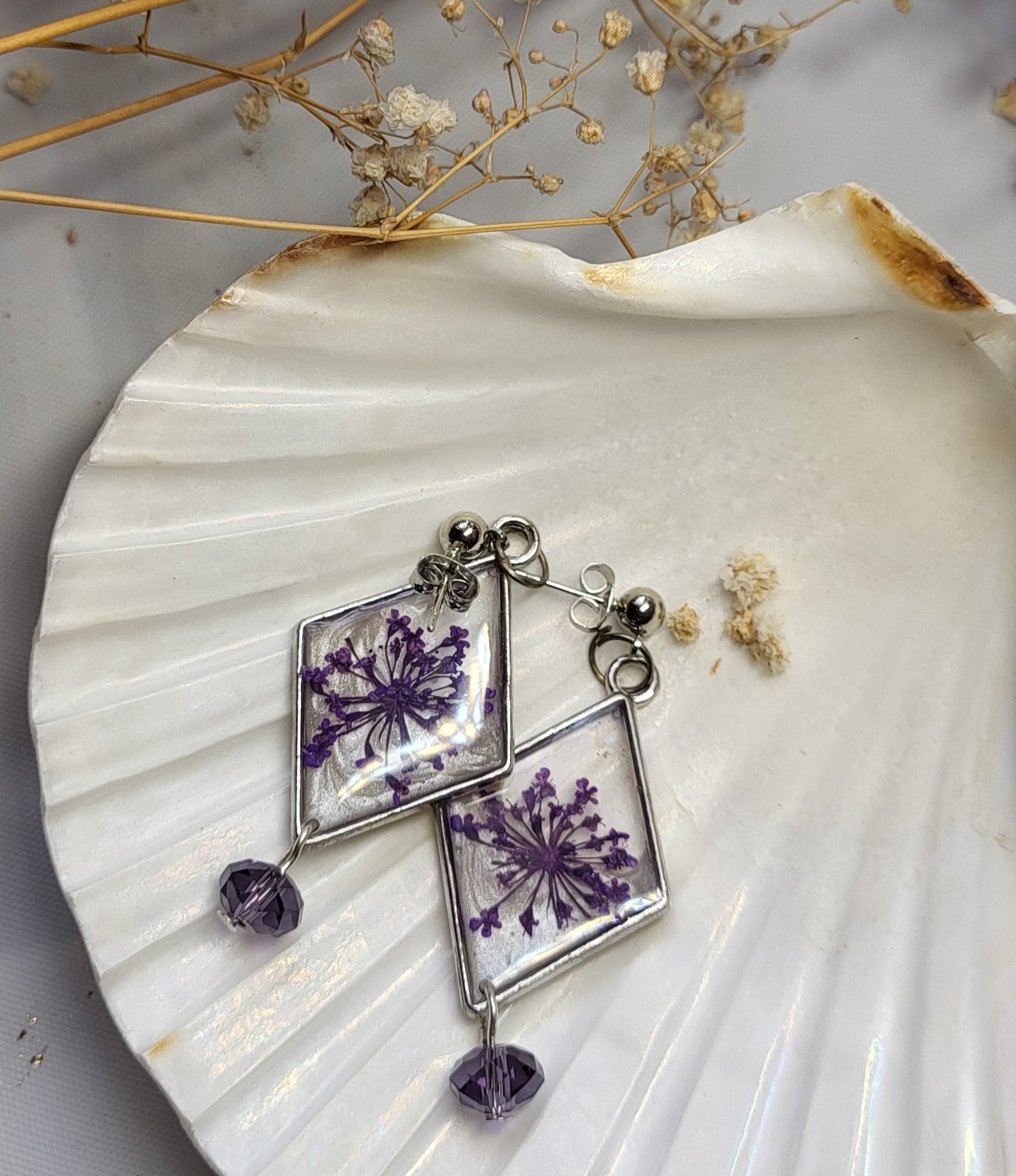 Handcrafted earrings featuring real preserved violet blooms encased in a rhombus-shaped resin frame with a silver finish. The transparent setting highlights the delicate floral details, while a faceted amethyst-toned crystal drop adds subtle sparkle and movement. A modern yet organic design that blends botanical beauty with geometric elegance.